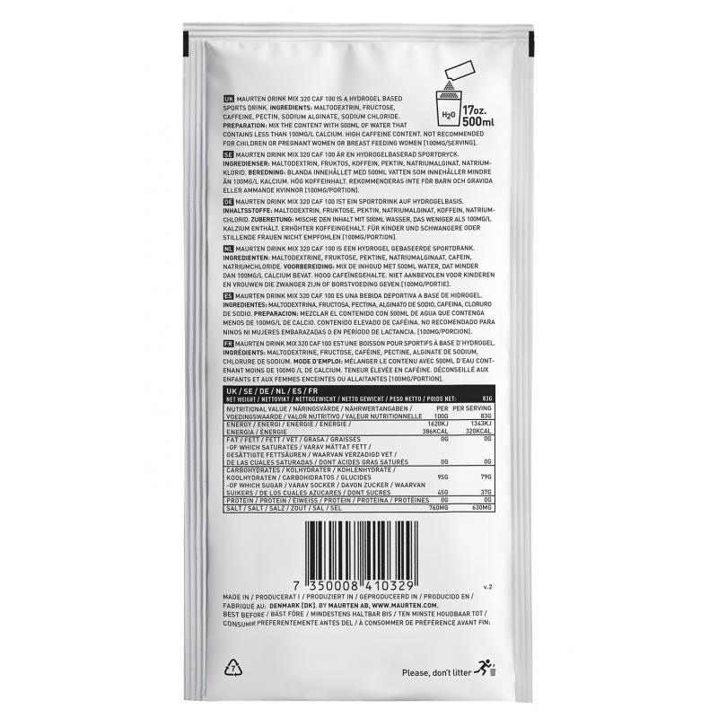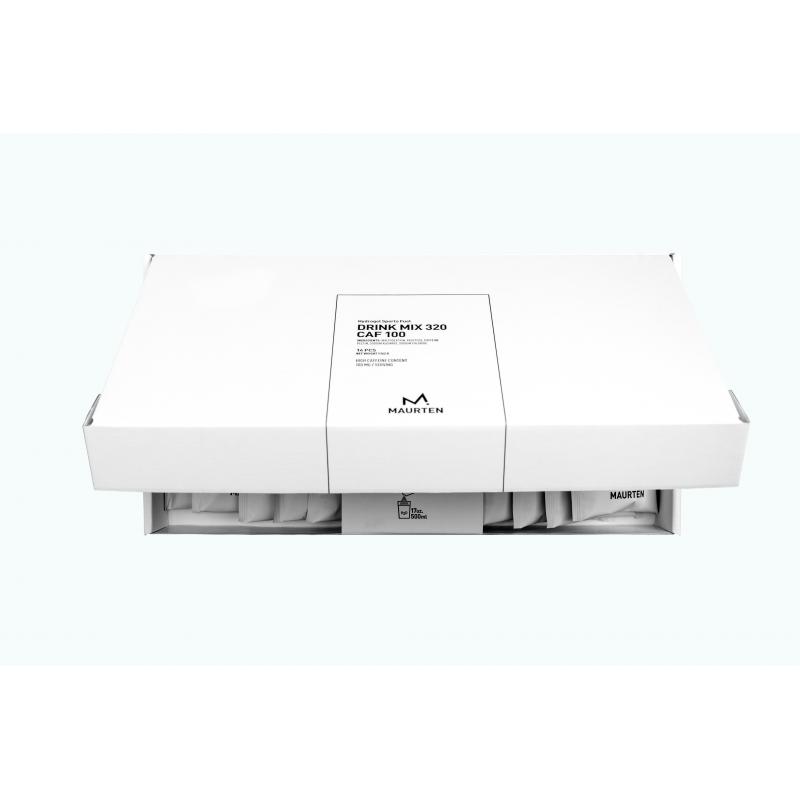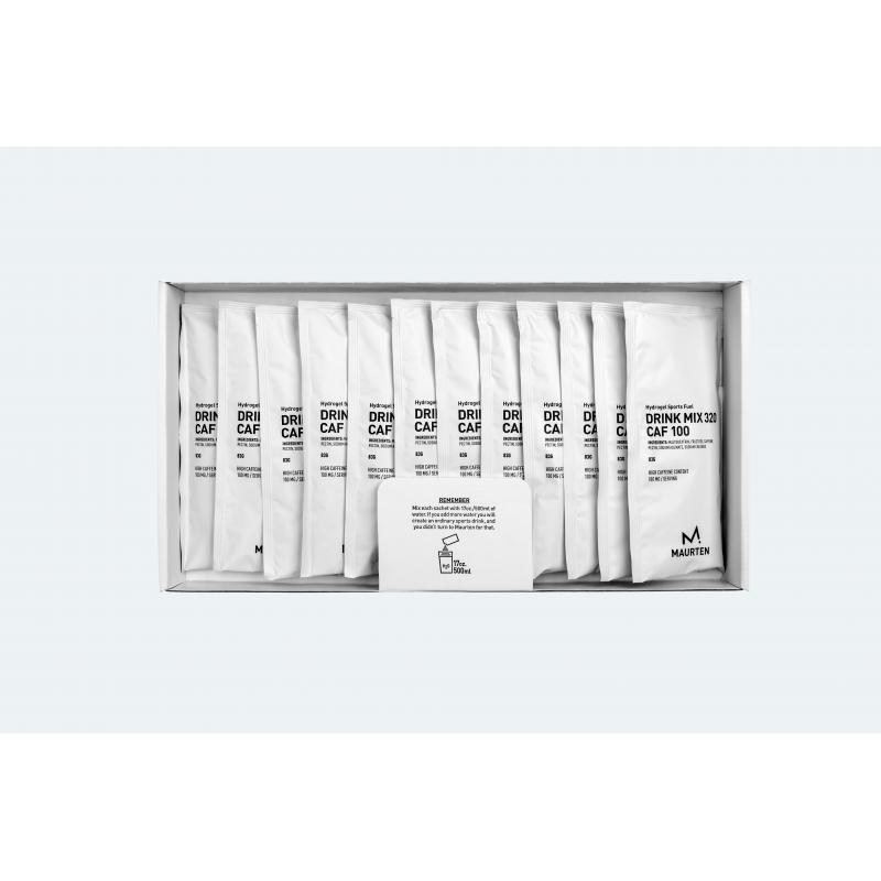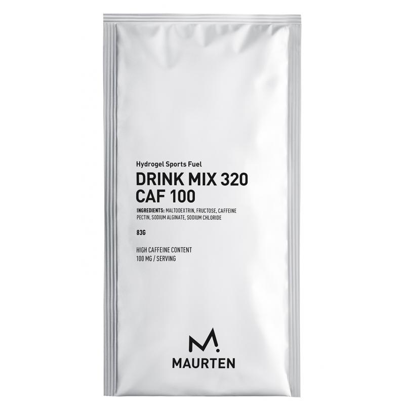 Maurten Drink Mix 320 Caf 100 er en karbohydratdrikk for utholdenhetsidretter som bruker Hydrogel Technology. Den inneholder 80 gram karbohydrater med 100 mg koffein per 500 ml vann. Koffein, karbohydrater og hydrering. Alt på samme tid – og på nivåer som gjør en forskjell. Drink Mix 320 Caf 100 fra Maurten har alt. Ved å bruke sin hydrogelteknologi har de til og med klart å kontrollere bitterheten som koffein vanligvis resulterer i – uten noen tilsatte syrer, smaker eller fargestoffer.