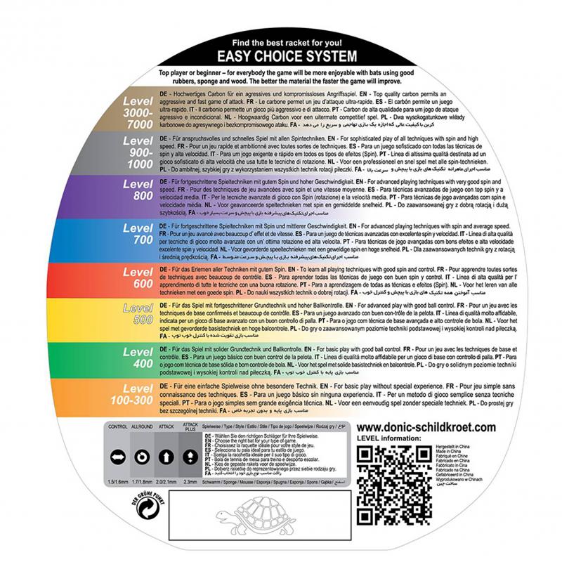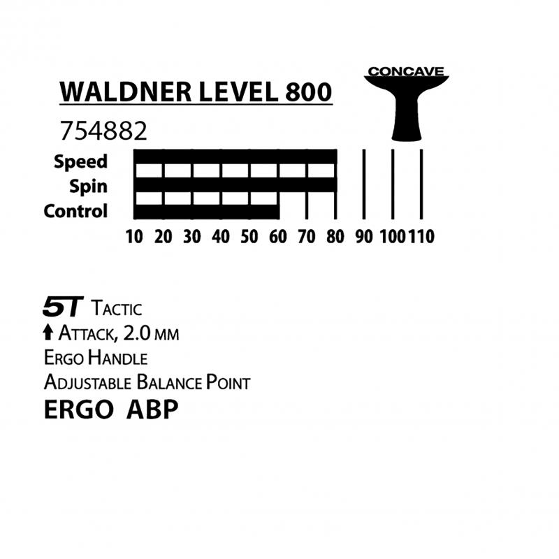 Waldner 800 4-star er en høykvalitets bordtennisracket som passer best for angrepsspillere som allerede mestrer teknikker som krever fart og skru. Vari Slick-gummien og skumgummilaget på 2,0 mm gir mye kraft i slaget og gir deg muligheten til å perfeksjonere teknikker som krever skru og hurtighet.Racketen har et justerbart balansepunkt (ABP), som gir mulighet for å finjustere og individuelt tilpasse forholdet mellom kraft og kontroll. Det avrundede ERGO-håndtaket ligger spesielt godt i hånden og har en jevn overgang fra blad til håndtak for å motvirke trykkpunkter og gi en sømløs overgang fra for- til backhand og omvendt.Godkjent for konkurranser av ITTF.