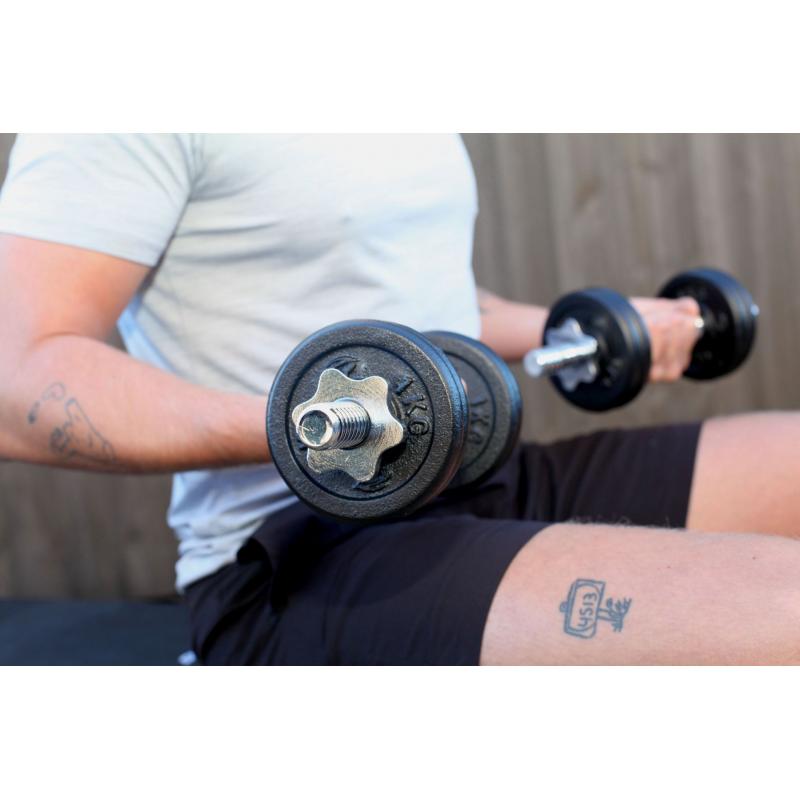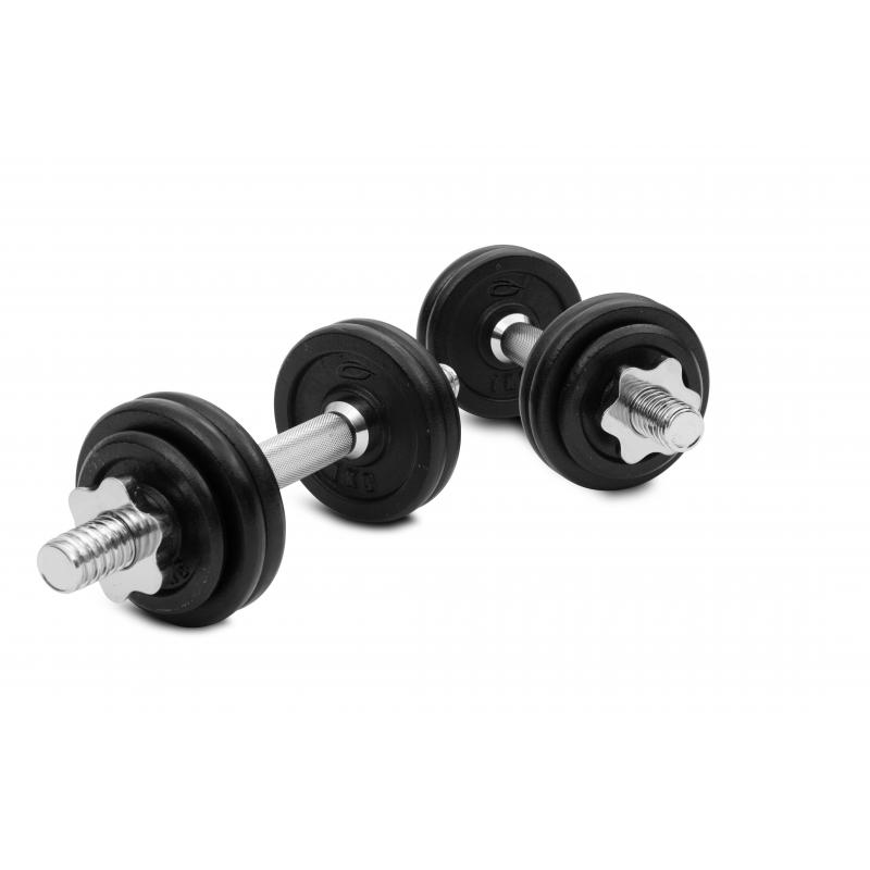 2 stk. hantler 1,25 kg.4 x 0,5 kilos vektskiver8 x 1 kilos vektskiver4 stk. låser (0,25 kg.). Innvendig diameter på vektskivene er 25 mm. Totalt en belastning opp til 13 kilo. Leveres i praktisk oppbevaringskoffert. Produsert i støpejern og forkrommet stål.