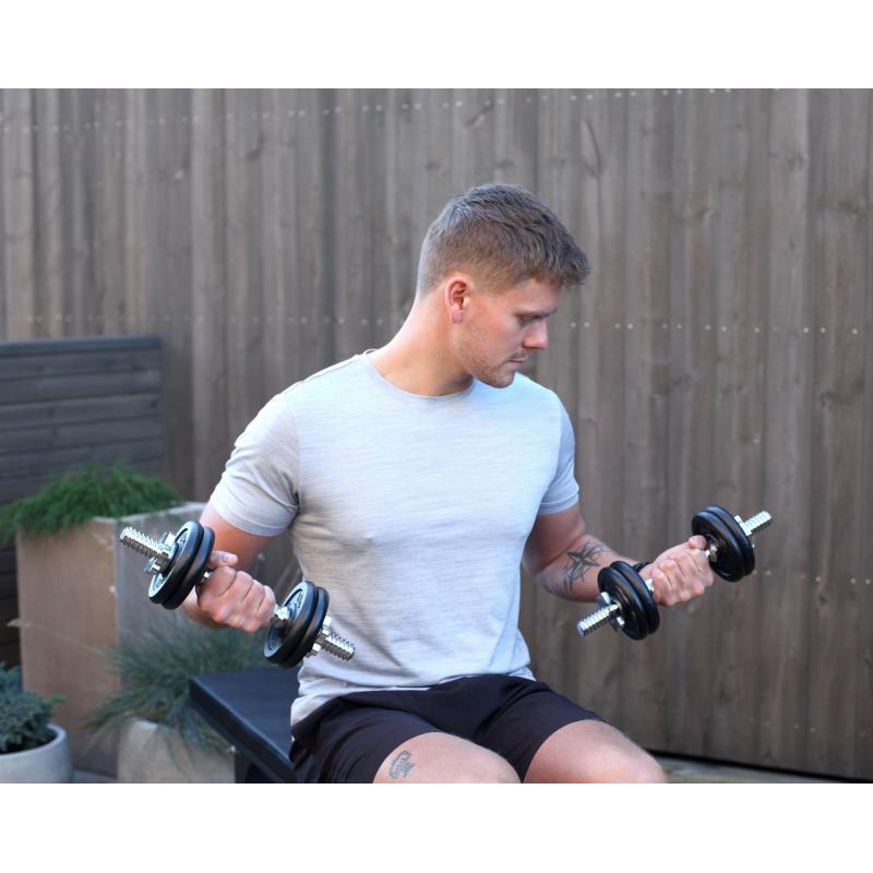 Utfordre hele kroppen med mulighet for å trene med 1 tung manual eller 2 lettere. Skulderpress, knebøy eller stående roing er noen av øvelsene du kan gjøre.